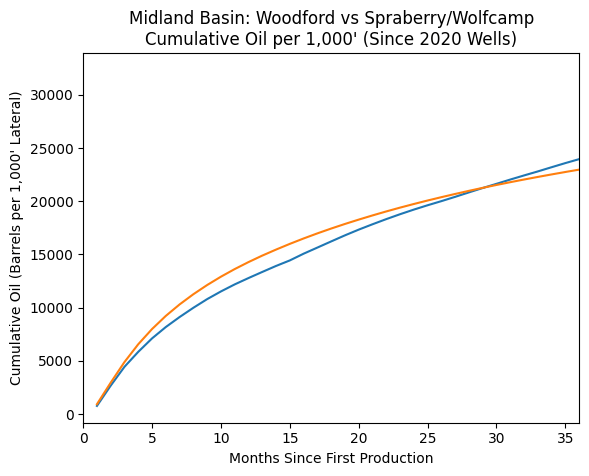 Early production favors the Spraberry/Wolfcamp. By 24 months the gap nearly closes. By 36 months, the Woodford slightly exceeds on a normalized basis. The production curve suggests that while the Spraberry/Wolfcamp may deliver stronger early oil volumes, the Woodford appears to exhibit a flatter decline profile through three years.
