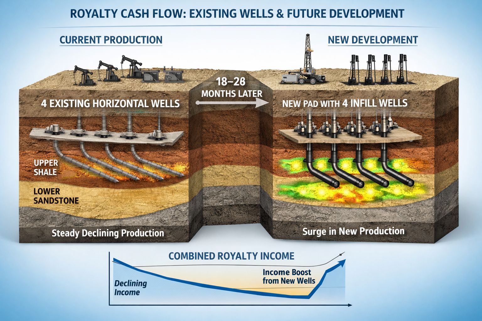 This is where development inventory becomes the advantage. As legacy wells naturally decline, follow-on pads and infill development can “refresh” the production base often creating a stair-step pattern in cash flow over time. The operator supplies the capital and execution; the royalty owner participates in the resulting production and revenue.