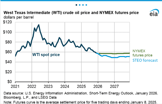 Looking into 2026, the EIA’s latest Short-Term Energy Outlook (January edition) frames a familiar setup for crude: global supply growth is expected to outpace demand, driving continued inventory builds and keeping prices flat to slightly depressed. In EIA’s base case, Brent averages about $56/bbl in 2026 (down from ~$69/bbl in 2025), with the pressure easing only gradually as inventory builds moderate later in the forecast.
